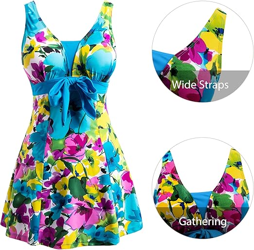 Full Bottom Coverage: One piece swimsuit with built-in bottom under the skirt.