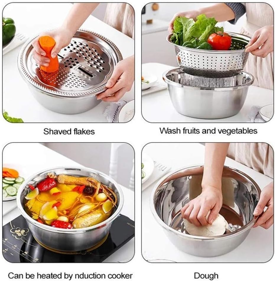Multifunctional Stainless Steel Basin With Grater Vegetable Cutter with Drain Basket 3 In 1 Graters Cheese for Vegetables 3-piece set (26CM)