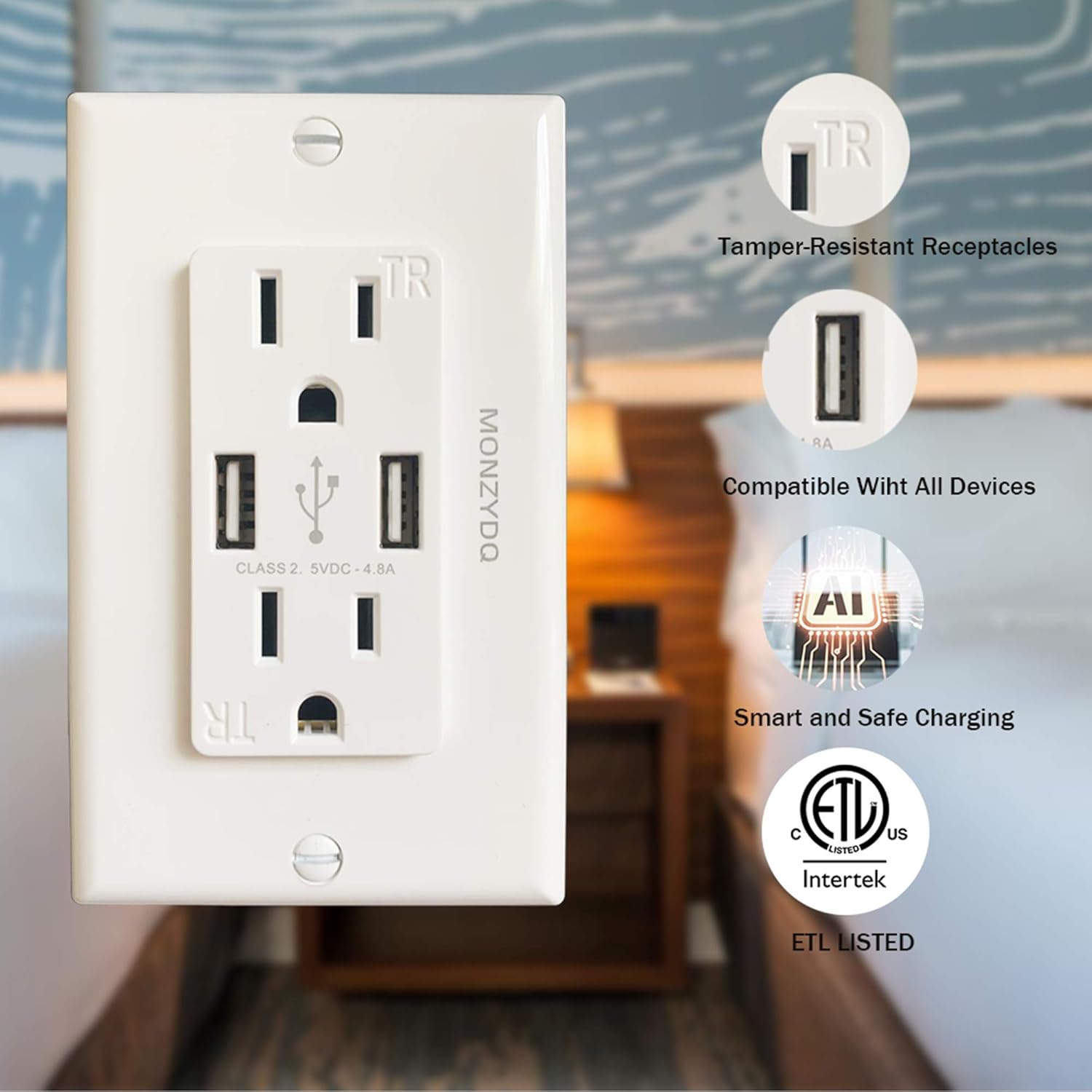 USB Wall Outlet 4.8A Charging Capability Duplex Receptacle 15 Amp Tamper-Resistant Electrical Outlets Wall Plate and Screws Include ETL Listed,White.