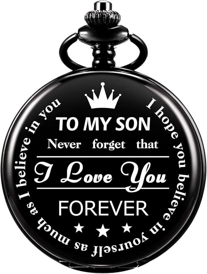 Personalized to My Son, Engraved Pocket Watches, Quartz Double Cover Roman Numerals Dial, Engraving Customization Custom with Box and Chain (Black Black)