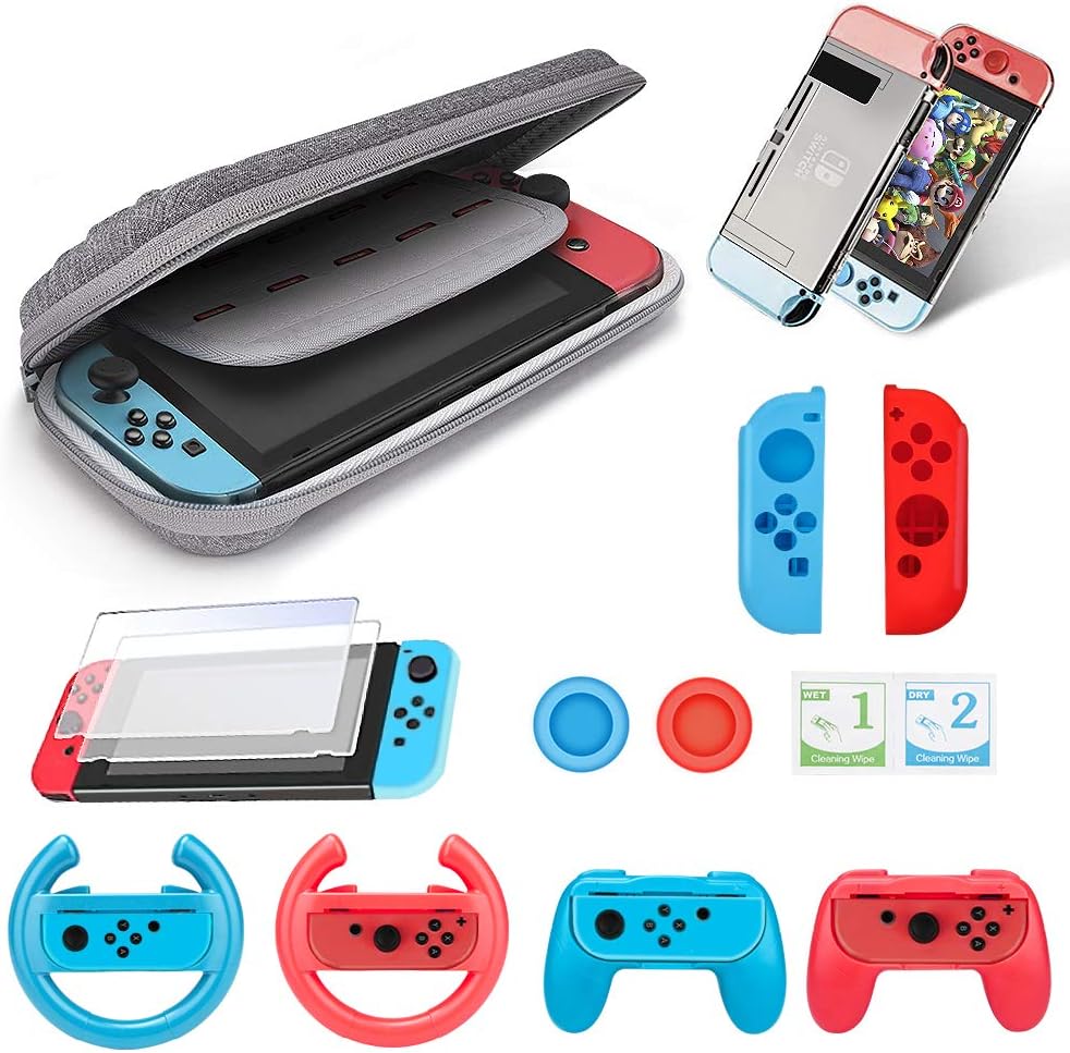 Accessories Kit Bundle for Nintendo Switch, 1x carry case,2x Grips kit,2x Steering Wheel,1x crystal case for switch,2x Case for Joy-Con,2x Thumbstick Caps,1x Glass screen protector